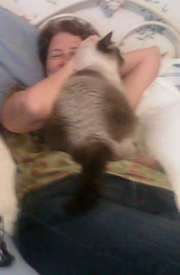 So WHO in the house is allergic to cats? OF COURSE - Roseanne! And WHO does Princess Miya HAVE to rub on, lay on, get as close to her face on? Roseanne!!!! Bad Miya - Bad Girl.